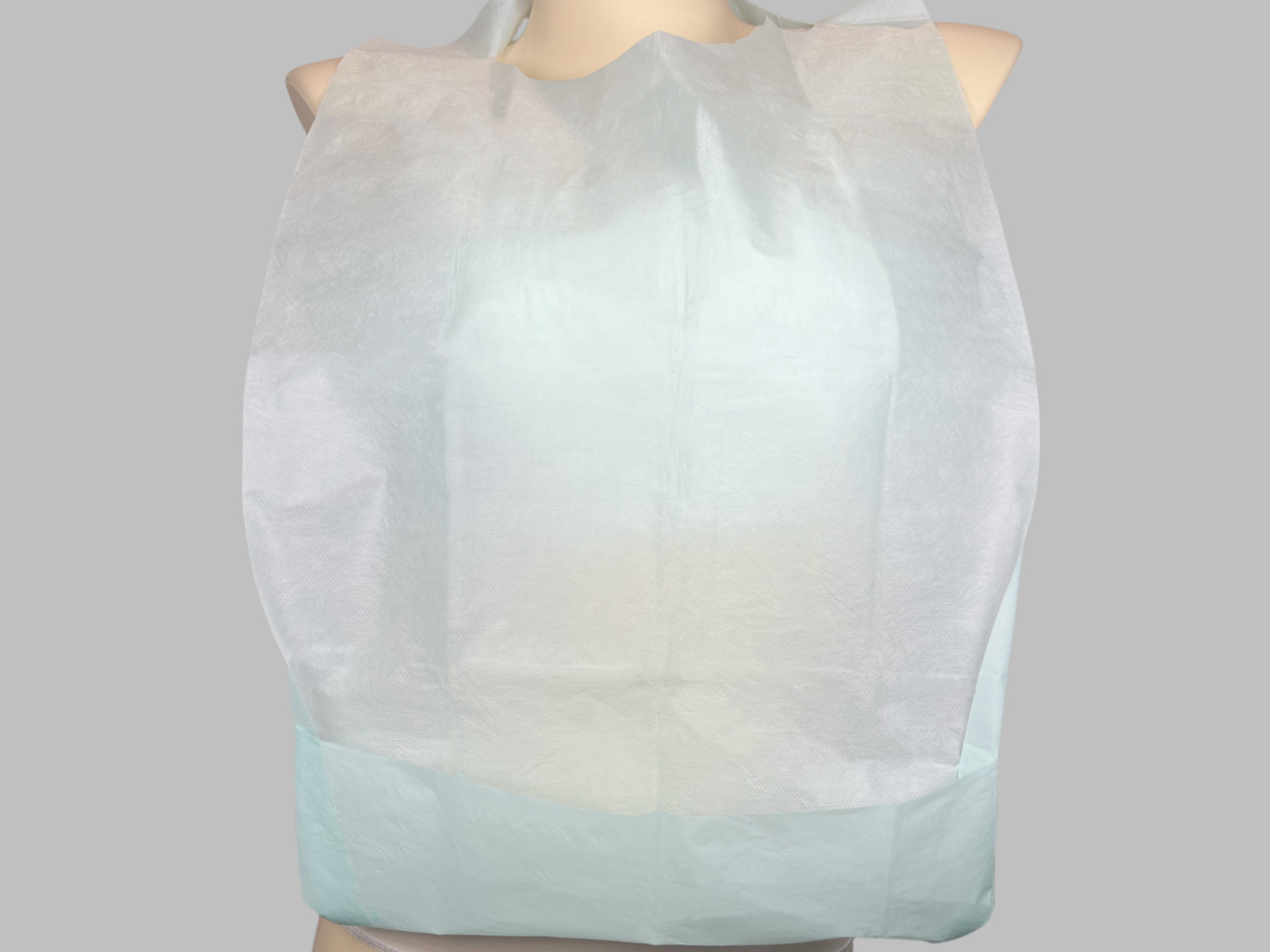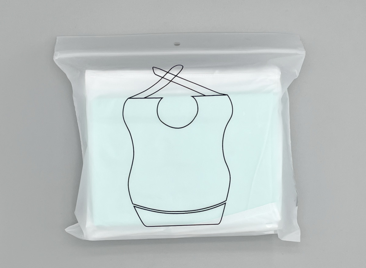 Adult disposable bibs are made from waterproof material combination of absorbent fabrics with PE backing to prevent spills from soaking through to clothing.